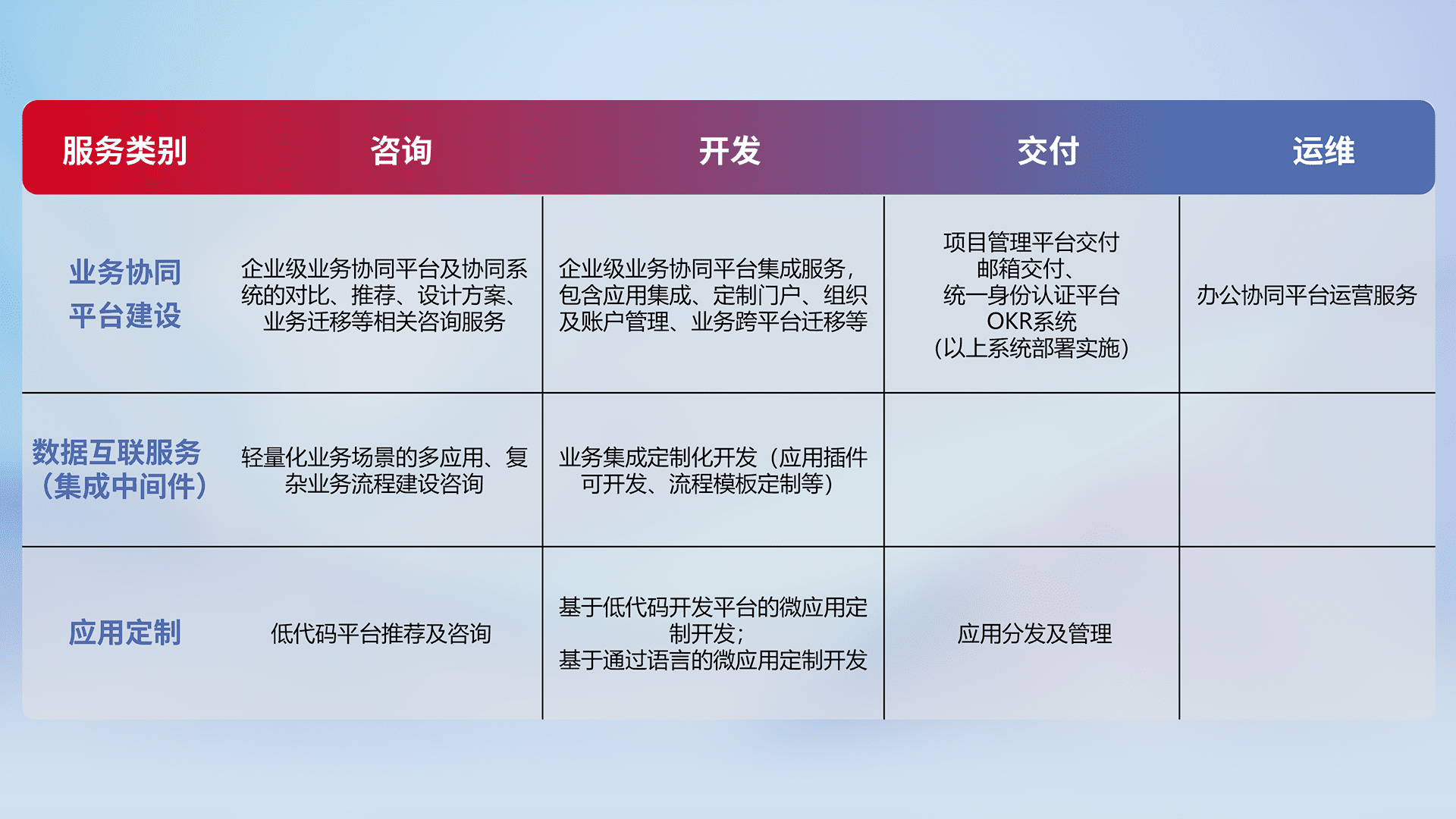 针对钉钉、、、、企微、、、IDaas等平台级产品提供产品的规划、、、、方案、、、交付、、定制化开发等服务,,,,实现如统一协同办公、、、智能客户服务、、、混合会议管理、、智能数据查询、、等业务场景,,实现数字化转型。。。